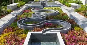 The outdoor watergarden. The ocular opening on the top floor, looking through it and it it....viewing from both sides. The museum is both a visual delight as well as a learning experience.
