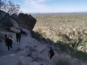 We arrived in the morning with water bottles, hiking shoes, hats, and sunscreen. Parking and restrooms are available at the base of the trail. This hike is 1.75 miles one way. It is a smooth crushed gravel pathway with a lot of steps, and a strenuous steep area the last 1/4 mile. It is 2,889 ft at the highest point. The views of the city from the trail are beautiful. There was a nice breeze and hikers were considerate. The cacti and desert terrain are lovely! One of our favorite hikes!