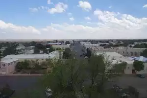 Eight sets of arched double windows give a panoramic view of the Marfa Plateau and the mountains which keep it from being miles and miles of nothing but miles and miles. Closer in is the view south down Highland Boulevard to the edge of town and an overview of the Presidio County jails, both old and new.
