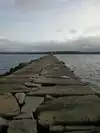 3/4 of a mile out and then back again on huge granite blocks. The surface of which is not even, smooth and has large gaps. Watch you step or you could fall in a hole and get hurt. It also very wind a you can get blown around as well. That said it is an interesting walk with the lighthouse at the end.
