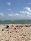 Small beach with shallow water. Lots of palapas and picnic tables for shade. Cleanest beach you will find in a Texas. City takes pride in their jewel!