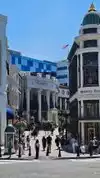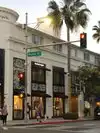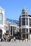 A street of expensive shops in Beverly Hills. One repeats finer shops along the entire length of the street.
