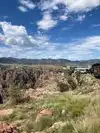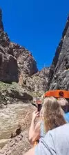 The scoop is; it’s $35 a person ($28 online according to our local friends). It’s not a National Park and the prices are exorbitant. So, step one; stop at the Canon City Visitor Center which is on the south side a the west end of the Veterans Park. There is a lady there that is full of factoids and stuff you can do. She told us that there’s an overlook that’s free; just drive into the parking and as you are driving it’s on the right side right by the fire hydrants (no parking). The parking is a circus and buses roll in by the dozens, literally. As you are driving down the hill leaving the park you will see a day picnic and overlook area called “The Elkhorn Loop and Picnic Area.” The road was rough, it’s less than a mile long. When you get to the part that is closest to the canyon, get out of your car and walk down the hill. You can take beautiful photos up and down the canyon. On the way back to Canon City you will come across the Skyline Drive. Only take it on the way home, it’s one-way and ends in Canon City. You can’t take motorhomes or large vehicles up there. Unbelievable. Built by the prisoners in the Canon City in 1905. Scariest drive in the world. The Jeep tours go up there if you’re not up for a death-defying drive. If you want to spend some money, take the train through the canyon. I believe it said it goes once a day out of Canon city.