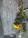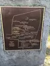A simple pathway with a rock with individual names of victims on each stone. Surrounded by the cemetery. Tasteful, peaceful a nice place for reflection.