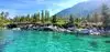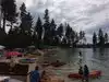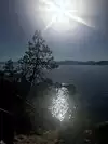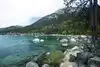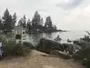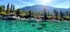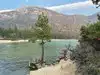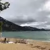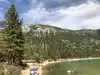 Surreal experience of laying on the beach while surrounded by the mountains and listening to the swaying pines. Nice bar and grill is present.