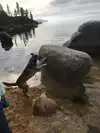 navigate the large round rocks along the shoreline.