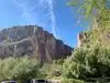 Towering cliffs on each side of the river protects the canyon from the hot sun. Shallow peaceful river that is great for wading (about knee deep when we were there) about a mile along the river.