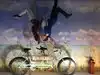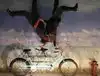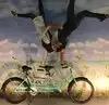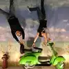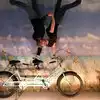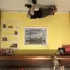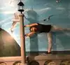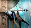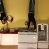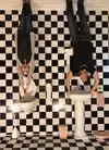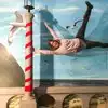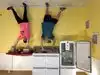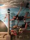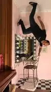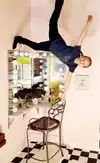 It's a photo shoot of silly perspective photos where you pose reaching out to an object painted on the wall or ceiling, or hold onto a physical prop and then pose with silly facial expressions like you're falling or screaming. Later, you rotate the photos so that it looks like you're falling from the ceiling or being blown sideways by the wind, etc.
