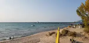 We absolutely love this beach and town. Perfect sandy beach and beautiful lake water. Lots of stuff for all ages. Park area for kids right on the beach, beautiful pier, carousel and great pizza. Even when the beach is busy there is tons of room.