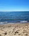 Beautiful beach with views of the lighthouse, a great spot for walking and enjoying the lake, taking photos, eating lunch, or swimming in the summer.
