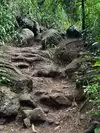 Just finished the EAST TRAIL. First things first: Bring water (at least 1L pP), wear good shoes as it is muddy, bring mosquito spray (or have it on you beforehand). Of course, it will get slippery when it rains (thank you captain obvious). As all trails do. If you're too fat, don't do the trail. Besides that, everyone who ever bought hiking shoes and they still fit can do this trail. It is not hard. When you reach the sign "stay on trail" with arrows to the right, go LEFT, it is easier. Climb a little upwards, then keep right, you will join the trail immediately after. If you can read "no" in pink on a rock, you've gone too far. Go a little back to join the trail. That way you don't need to climb a 2-3m rock. When you reach the chin, there is the most difficult part to climb (which is actually not difficult but that's how hard it will get), see picture. In all, the hardest thing is walking 1hr in the heat uphill. And the view is fantastic!