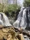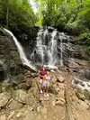 Located 10 mins from Cherokee a beautiful double falls right off of US 19 in Maggie Valley. The trail down to the viewing platform is uneven and rocky when its wet it can be very sketchy hiking poles wouldn't be needed when dry but on the day we went it was very wet so my 68 year old mother used the poles to keep her balance. Getting down to the base of the falls can be very difficult when its wet thankfully there are guide ropes to hold on to. I used them to go down backwards like rappelling the rope down to the base. I had my backpack with my camera gear so I could use my hands. For the better photos you want to get down to the base of the falls. My insistent mother slid down on her bottom. I read that there have been some deaths as a result of people climbing the falls and slipping when we were there we witnessed a family climb up to the top of the falls and it looked super sketchy and not worth the risk.