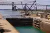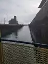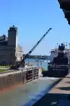 This is the shipping arrangement between Lake Superior and Huron. Once the ship is inside the locks the gate is closed which are water tight. Water table is raised or lowered 21 ft by the force of gravity and the gates are opened when the water level is same on the opposite side of one of the locks. Then ship passes to the other side of the lakes.