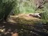 We were keeping ourselves hydrated by drinking water and juice. Only after hiking up 2 miles did we realize that we were almost out of water - panic moment. It was very hot~100F and getting hotter with almost no shades to rest under. Thankfully, there is a stream on the way that's accessible from the trail and the water on that stream looked very clean. We filled up a couple of disposable water bottles from the stream and used the aquatabs to treat the water and also added the electrolyte to it. Also, there are a couple of points on the trail where we had to cross the stream. Not a bad idea to take a break there and immerse yourself in the cold and refreshing water.