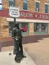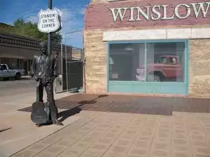 Stopped on the way to Painted Desert/Petrified Forest National Park. There are 2 statues and a flatbed Ford on the corner. On a building behind them is a mural about the song. Huge Route 66 sign painted in the intersection. Two gift shops across the street one playing Eagles songs on a loudspeaker. Worth the time to stop for a half hour or more.