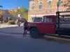 Everyone has to do this - there is nothing to it but somehow it is just a lot of fun. It's easy to stand there, no one ever takes long. Yes there is a flat bed ford parked there too. The building behind is actually a well painted wall - you'll see if you walk around. The two stores on the corner are doing a great business being in this spot. Luckily near some good restaurants so you can just walk over, though we found parking easy enough, and no meters!