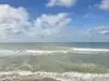 Nice clean beach , fairly busy for a Monday . The waves were a little rough. We found lots of shark teeth just lying on the beach. Water is a beautiful blue color. Would definitely go again.