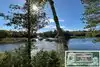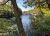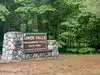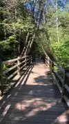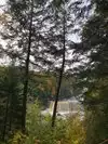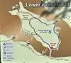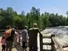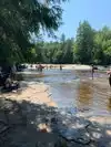 You can hike the trail to the Lower Falls starting by campsite 125 and to the right towards sign "16". It is a nice wooded and sandy trail. Walk .3 miles to the "16" sign, then another .3 miles to the left to the "13" sign. Walk along the boardwalk and when it ends, you can cross the river to the island - it is only knee deep at it's deepest. Don't pay for a row boat, walking across is just as easy. We walked through the river a little before getting on the island and hiking that trail. Kids were swimming in the water all around the island. Then we hiked towards sign "14" by the bathrooms and took the trail towards "15" and walked right back to near site 125. (.7 miles) The total hike was very sandy and full of pine needles, lots of stairs, but we never saw any nature- animals.