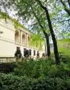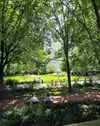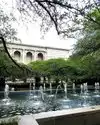AIC South Garden is a true masterpiece, designed by a famous landscape architect Dan Kiley, and built in 1962--1967. As a grid-structure garden, South Garden is a striking example of regular geometry. The unforgettable centerpiece sculpture Fountain of the Great Lakes (1907- 1913) is a grand artwork by a world-renowned landscape architect Lorado Taft. The large bronze sculpture depicts five women, symbolizing the 5 Great Lakes. The sculpture is flanked by Sargent crabapple trees, and in front of it there's a pool of water with a grid of low jets. At the sides of the pool, in the raised planters with marble edges, there are sixteen hawthorn trees, their branches forming a dense overhead canopy. There are benches for visitors to relax and enjoy the whole scenery. The huge honey locust trees at the entrance to the garden also screen the garden from the busy South Michigan Avenue.