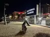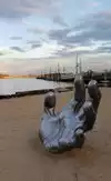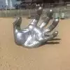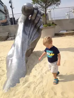 A huge sculpture of a drowning (?) man. The area is covered in sand and is close to the water, so it gives it a beach feel. Kids can play in the sand and climb the sculpture. There are stores and restaurants that surround this area. It is clean and safe. Fun family-friendly area.