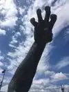 This is a 70 some-odd foot sculpture of a giant man struggling to climb out of the sand. Only parts of the head, hands, feet and one knee are visible.