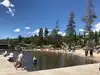 Nice stretch of beach on this cool (temp) lake. In the morning it is calm and glassy, but by 11am the winds whip around the beach, making perfect weather for sailboats. There were a ton of little sail boats manned by kids a couple mornings when we were there. Great to watch. You can rent Peddle Boats right there for roughly $35 an hour. A couple benches on the pier, and tables on the beach make for a good place to sit for a while. It does get cool in the afternoons and early morning so you'll want long sleeves even in July.
