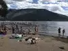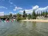 Beautiful sandy lakeside beach. A bit small. Amazing mountain views. You can rent kayaks, paddle boats, motor boats. Dog friendly. Snack stand nearby along with clean public bathrooms.