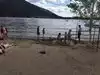 Tiny beach, but a beautiful lake. Some kids did go into that cold water. We rented kayaks next door and fought the wind. One should do that when the wind is still.