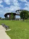 This is a pedestrian bridge that connects downtown Louisville to Jeffersonville, IN. The bridge is located at Waterfront Park which is expansive. There are benches nearby as well as a kids play area.