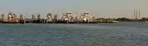 On a recent visit to Texas we decided to take an alternative and more attractive route from Corpus to Houston....to include the Port Aransas Ferry...we had read of delays and long waits..On arrival there were perhaps around 40 vehicles queueing...but within a few minutes we were on one of the three ferries operating that day and ten minutes or so later after allowing river traffic to pass we were on our way for the short crossing.