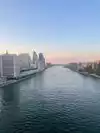 Roosevelt Memorial and old hospital on one side and city on the other side of the island