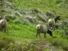 Also, after about 2 miles, the elk began to appear wherever they chose to roam. A large herd was down in a valley a couple of hundred yards from the trail, while a smaller group was up in a meadow less than 100 yards from the trail. Others were seen on slopes and walking the coastline. We got a sense that the elk became a bit irritated and would move away if they found themselves too close to hikers and the trail.