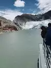 We went on a large cruise ship "Explorer of the Seas" and there was a mini-heat wave with quite warm weather in mid-September which resulted in a lot of ice carving. Unfortunately our captain felt it was not safe to take the ship into all that ice so we could only see the glacier at great distance. All we saw was a lot of small icebergs coming down the fiord.