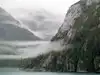 Anyway, The scenery in Tracy Arms is STUNNING. We were told a day in advance that the skies were going to be overcast, but no rain so we were prepared for that. The other couple we were with and us were all in our 60's, we bundled up, and spent about 5 hours on the upper deck in the elements snapping more pictures than you can imagine. The low-hanging clouds and fog added an eerie effect to the pics as you can see. Plenty of waterfalls, small icebergs, and at the end of the Fjord ... there it was - Sawyer Glacier.