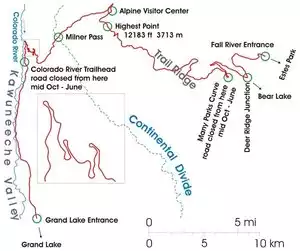 Trail Ridge Road is about 48 miles of US 34 between Kawuneeche Visitor Center to Fall River Visitor Center, driving across the mountain ridges above 11,000 feet to the top of the Rockies in alpine environments, as the highest paved road in Colorado.