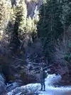 Treasure Falls is a 100-foot waterfall just of US-160 15 miles east of Pagosa Springs. We visited in early April and it was still very snowy. The falls are viewable from the parking area and two short trails lead up to the base. The main trail is pretty easy and the primitive trail is quite steep. We wore micro-spikes and went up the primitive trail and then back down the easy trail. Don't attempt without traction devices if its icy. There is a footbridge across the creek well below the falls and the Misty Deck for a closer view up close. As the name implies, you will get wet at the deck. Overall, a beautiful waterfall and worth an easy stop if in the Pagosa Springs area.