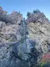 To avoid a dangerous descent we chose to traverse a 70-degree slope and cross the water at the base of the falls, and took the main path down. Handing my 2-y.o. off to her mom across the falls reflected one of the poorer choices of my career as a dad.