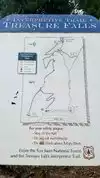 Treasure Falls can be seen from the road, but it is much better (especially for the driver, who should be watching the road) to pull over and hike to the falls. Just be careful pulling back out onto the highway. There are always people who think they know a better way to get somewhere than the people who built the path, or think they can get a better view. However, making your own trails causes erosion, usually takes longer, and is more difficult than the designated route, That is the case here. Stay to the left to avoid a lot of wasted effort and frustration. Even on the left, put the baby in the backpack as this is no place for strollers or wheelchairs.