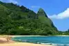 The stretch of semi-sheltered beach on the north shore of Kauai which includes Tunnels beach and Ha'ena beach (they blend into each other in this small sweep of beach) is a lovely beach for swimming and scenery. Kauai has much beautiful coastline but not many beaches that are really good or safe for swimming. This area is on that is great for swimming and it has nice coral areas easily reached, with lots of fish and sea life to examine. The setting is also beautiful and even dramatic, with a lovely, lush forested peak sweeping around and looming over the western end. At the western end is Ha'ena county beach park, with restrooms. Some parts are more gentle, others more rough.