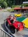 Great fun, be sure to wear glasses to avoid getting cinders in your eyes. The cars are open sided and not advised to go on rainy days. The only available food are hot dogs, chips, and soda drinks.
