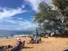 This is a very nice beach. There is some shade, but a lot of people brought umbrellas. There is a reef structure close enough to swim out to. We saw a lot of colorful fish.