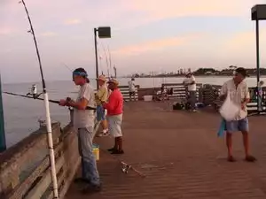 This sturdy concrete pier extends several hundred feet into the gulf . There is a shop on the pier that rents fishing poles and sells bait tee shirts and snacks n sodas. There are stations with running wAter where you can clean your catch and a restaurant that will even cook it for you. .