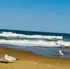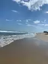 A beautiful, sandy beach with easy rolling waves in places. The concrete boardwalk is very wide, with plenty of parking available within a block.