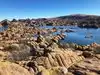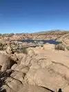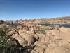 If you're physically fit, take the loop trail all the way around the lake (we went counter-clockwise, traversing the flat section first). Simply stunning views of the lake and the ancient, oddly shaped boulders, many of which one must scramble over. Highly recommended. Well marked with signs and white marks, which are more important than you might think, since there are options along the loop, and much of the trail is over boulders. Took us 3 hours. Carried 2 bottles of ordinary-sized water each, and ran out at the end. Be sure to take at least that much water. AZ is not only hot but dry.