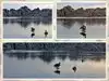 The next morning's sunrise had that pink hue for maybe 5 minutes. We were down at the boat dock. Fortunately there were a couple geese that entertained us as well as several ducks including a beautiful Golden Eye. I also saw another Great Blue Heron in the distance and we had some geese flyovers.