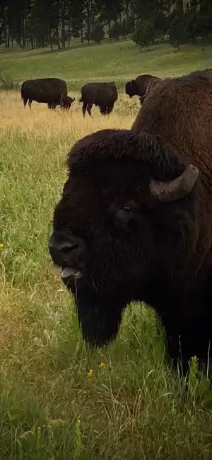 Soaring across prairie . gulch and rolling peaks is the wildlife loop in the Custer State Park- at late afternoon or even early morning you will see deer grazing thoughtfully by the side of the road and if you are lucky you ,might see pronghorns , big horned sheep donkeys and of course bison - it was a lengthy journey but we did it twice and were rewarded with great piles of buffalo some in the road and one mama was nursing her little yearling in the center of the bi way - needless to say we all stayed in our cars - well worth the $20 for the weeks access - we used it three times in a week- well worth the driving !!Do it !!