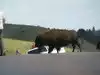 Of course, being right off the side of the road, gawkers *such as ourselves) were quick to take some snapshots and pus the boundaries and try to get close to the animal. One fellow got a little too close, which made the Bison a little hot and bothered and that resulted in much yelling by the local ranger trying to make sure none of us idiot-ed ourselves into injury from the animal.