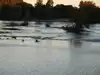 There are many beautiful giant trees along the shore of the river, an ancient cherry tree, and a flower garden with roses and flowering trees, and many green areas to sunbathe.
