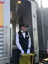 Service attendant in our car was young and inexperienced (Adriana)-kept laughing at herself. She announced in advance when the skit men were going to rob the train- and literally begged for money to be in plane sight so the robbers could take the money