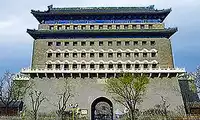 This is one of the two towers of Zhengyangmen, and it is the arrow tower on the south side. This image is used in Daqianmen cigarettes.
